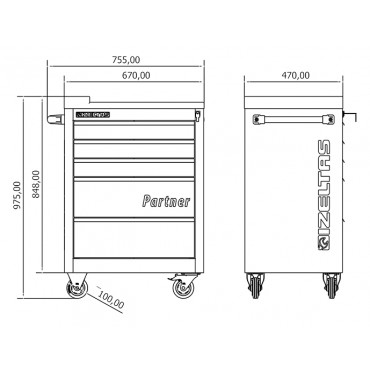 - 2 ruedas giratorias con freno, 2 ruedas fijas, ø 100mm.