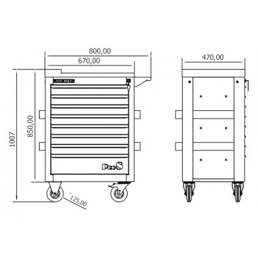 - 2 ruedas giratorias con freno, 2 ruedas fijas ø 125 mm.