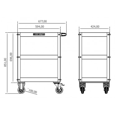 - 2 Ruedas giratorias con freno, 2 ruedas fijas, ø 100 mm.