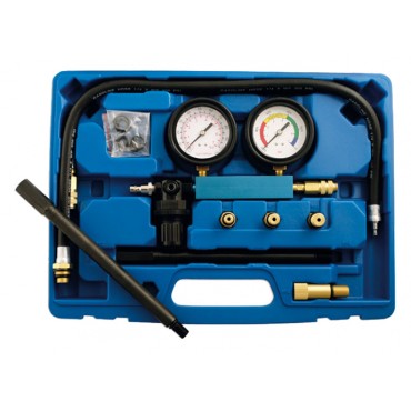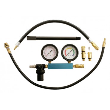 • La presión de trabajo de 100 psi (7 bar) muestra el origen de la pérdida de compresión, así como el porcentaje de pérdida a través de los manómetros dobles.